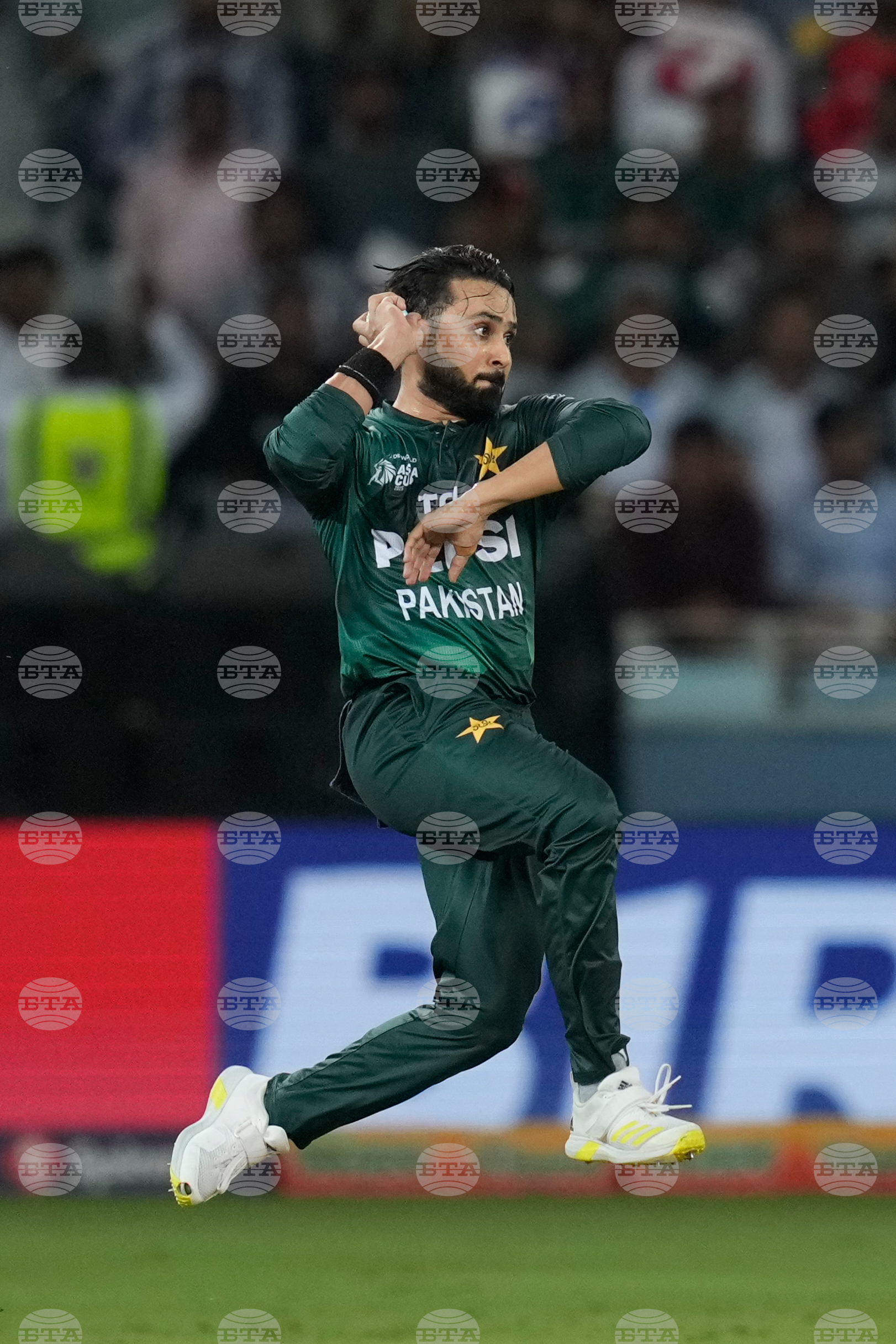 Pakistan's Mohammad Nawaz celebrates the dismissal of Bangladesh's Mehedi Hasan during the Asia Cup cricket match between Bangladesh and Pakistan at Dubai International Cricket stadium in Dubai, United Arab Emirates, Thursday, Sept. 25, 2025. (AP Photo/Altaf Qadri)