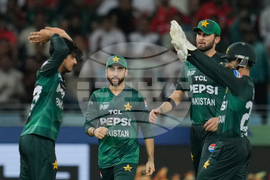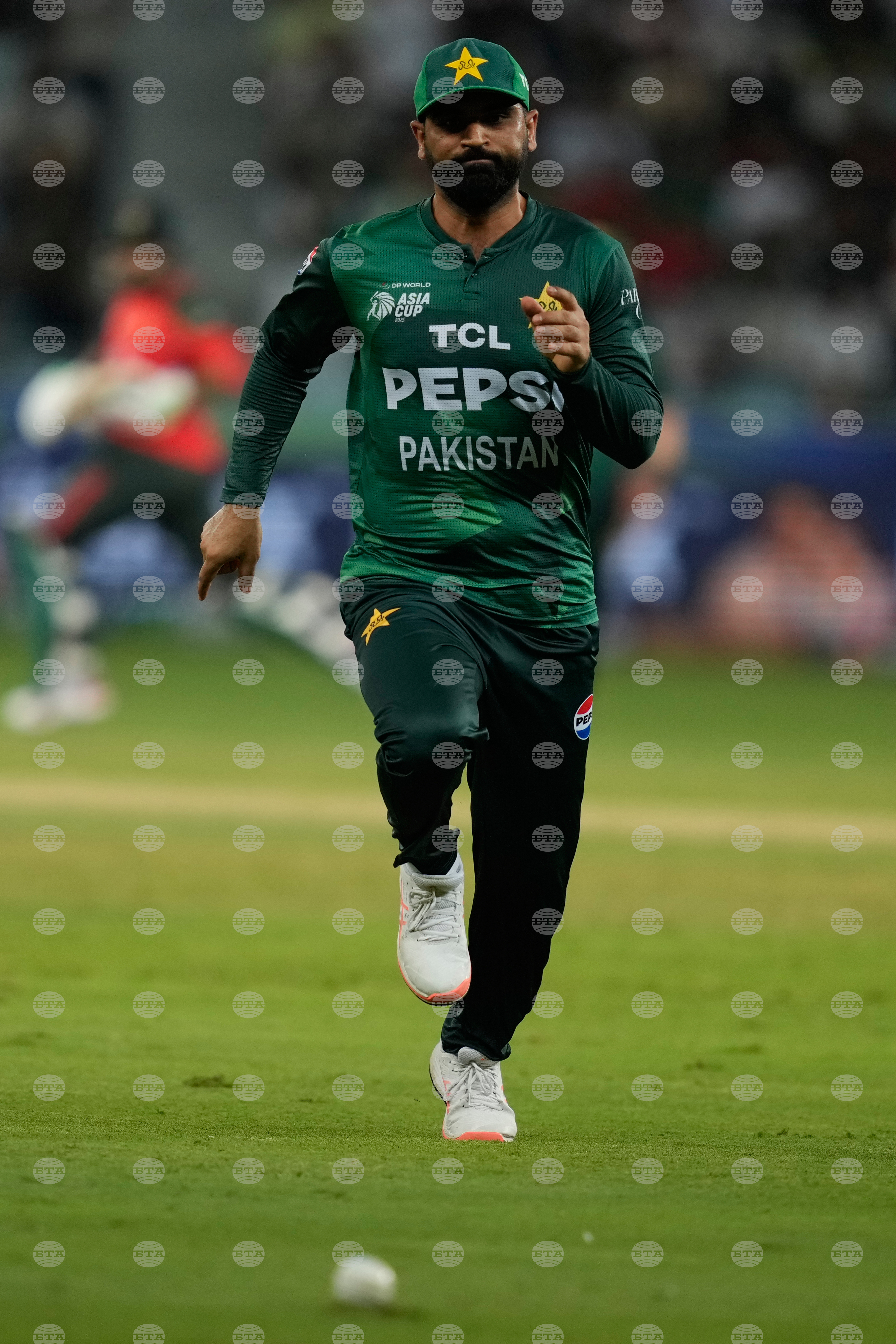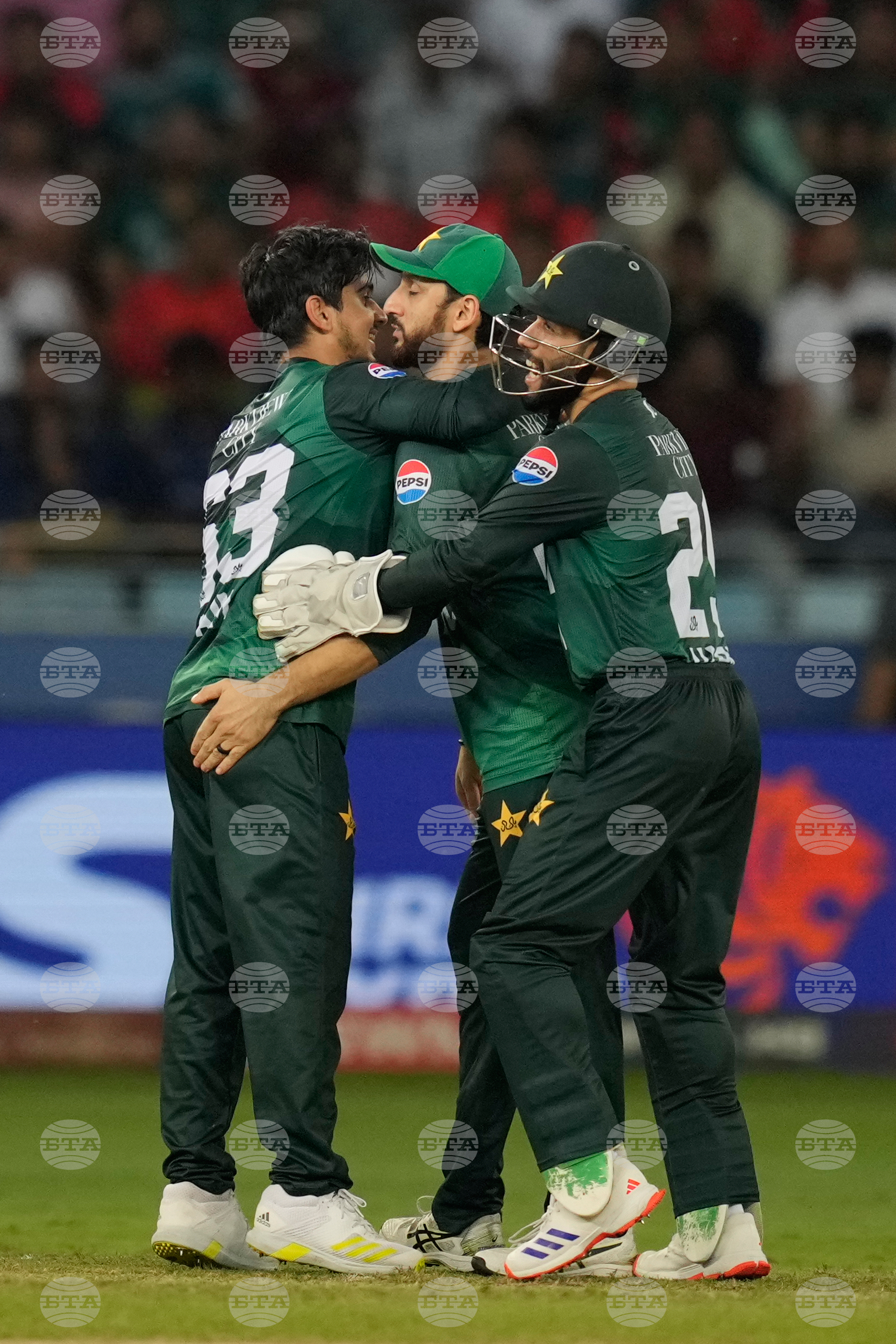 Pakistan's Mohammad Nawaz, left, celebrates with teammate after the dismissal of Bangladesh's Mehedi Hasan during the Asia Cup cricket match between Bangladesh and Pakistan at Dubai International Cricket stadium in Dubai, United Arab Emirates, Thursday, Sept. 25, 2025. (AP Photo/Altaf Qadri)