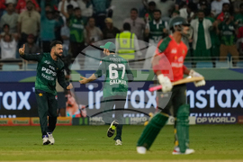 Pakistan's Mohammad Nawaz, left, celebrates after the dismissal of Bangladesh's Mehedi Hasan, center, during the Asia Cup cricket match between Bangladesh and Pakistan at Dubai International Cricket stadium in Dubai, United Arab Emirates, Thursday, Sept. 25, 2025. (AP Photo/Altaf Qadri)