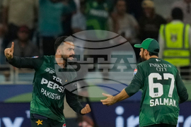Pakistan's Mohammad Nawaz, left, celebrates with Pakistan's captain Salman Agha after the dismissal of Bangladesh's Mehedi Hasan during the Asia Cup cricket match between Bangladesh and Pakistan at Dubai International Cricket stadium in Dubai, United Arab Emirates, Thursday, Sept. 25, 2025. (AP Photo/Altaf Qadri)