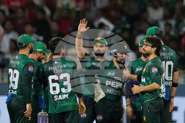 Pakistan's Saim Ayub, left, celebrates with teammates after the dismissal of Bangladesh's Nurul Hasan during the Asia Cup cricket match between Bangladesh and Pakistan at Dubai International Cricket stadium in Dubai, United Arab Emirates, Thursday, Sept. 25, 2025. (AP Photo/Altaf Qadri)