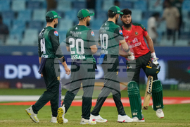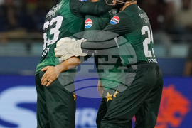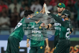 Pakistan's Mohammad Nawaz, left, celebrates after the dismissal of Bangladesh's Mehedi Hasan, right, during the Asia Cup cricket match between Bangladesh and Pakistan at Dubai International Cricket stadium in Dubai, United Arab Emirates, Thursday, Sept. 25, 2025. (AP Photo/Altaf Qadri)