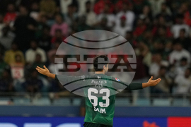 Pakistan's Saim Ayub celebrates the dismissal of Bangladesh's Nurul Hasan during the Asia Cup cricket match between Bangladesh and Pakistan at Dubai International Cricket stadium in Dubai, United Arab Emirates, Thursday, Sept. 25, 2025. (AP Photo/Altaf Qadri)