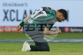 Pakistan's Shaheen Shah Afridi celebrates the dismissal of Bangladesh's Parvez Hossain Emon during the Asia Cup cricket match between Bangladesh and Pakistan at Dubai International Cricket stadium in Dubai, United Arab Emirates, Thursday, Sept. 25, 2025. (AP Photo/Altaf Qadri)