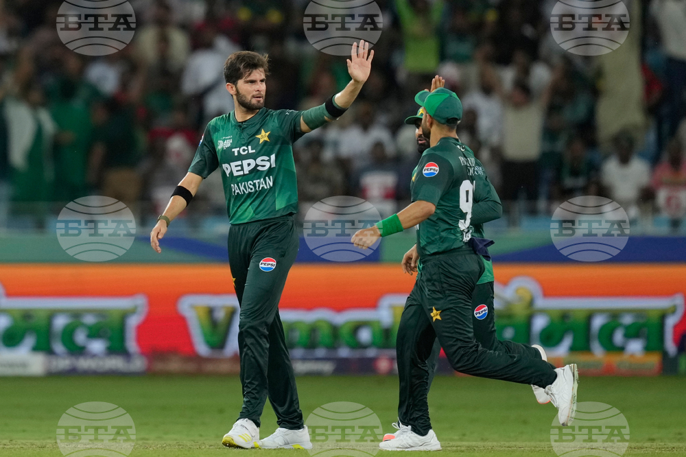 Pakistan's Shaheen Shah Afridi, right, celebrates with teammate after the dismissal of Bangladesh's Towhid Hridoy during the Asia Cup cricket match between Bangladesh and Pakistan at Dubai International Cricket stadium in Dubai, United Arab Emirates, Thursday, Sept. 25, 2025. (AP Photo/Altaf Qadri)