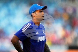 India's captain Suryakumar Yadav warms up before the Asia Cup cricket match between India and Sri Lanka at Dubai International Cricket Stadium, United Arab Emirates, Friday, Sept. 26, 2025. (AP Photo/Altaf Qadri)