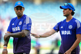 India's Abhishek Sharma, right, talks to captain Suryakumar Yadav as they warm up before the Asia Cup cricket match between India and Sri Lanka at Dubai International Cricket Stadium, United Arab Emirates, Friday, Sept. 26, 2025. (AP Photo/Altaf Qadri)