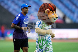 India's captain Suryakumar Yadav runs next to the tournament's mascot before the Asia Cup cricket match between India and Sri Lanka at Dubai International Cricket Stadium, United Arab Emirates, Friday, Sept. 26, 2025. (AP Photo/Altaf Qadri)