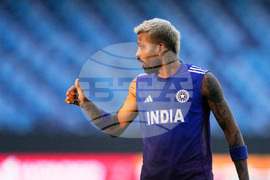 India's Hardik Pandya warms up before the Asia Cup cricket match between India and Sri Lanka at Dubai International Cricket Stadium, United Arab Emirates, Friday, Sept. 26, 2025. (AP Photo/Altaf Qadri)