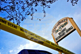 FILE - Crime scene tape still surrounds Schemengees Bar & Grille, Sunday, Oct. 29, 2023, in Lewiston, Maine. (AP Photo/Matt York)