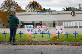 FILE - A woman visits a makeshift memorial outside Sparetime Bowling Alley, the site of a mass shooting, Oct. 28, 2023, in Lewiston, Maine. (AP Photo/Robert F. Bukaty, File)