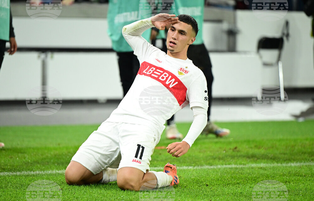 VfB Stuttgart's Badredine Bouanani celebrates scoring a goal during the Europa League soccer match between VfB Stuttgart and Celta Vigo at MHPArena in Stuttgart, Germany, Thursday, Sept. 25, 2025. (Bernd Weissbrod/dpa via AP)