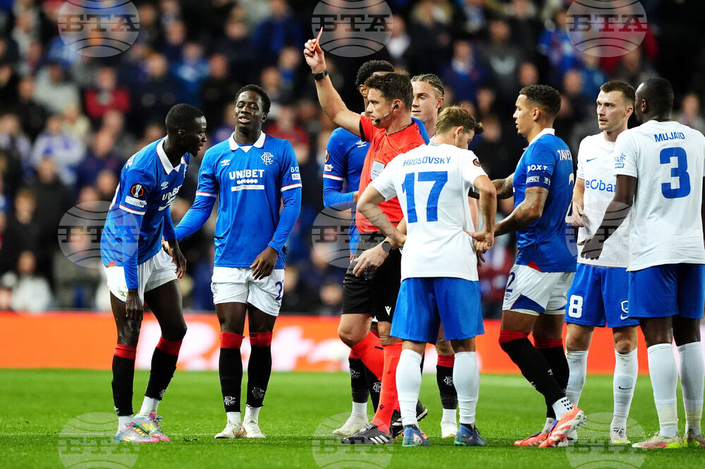 Rangers' Mohammed Diomande, left, is shown a red card by referee Matej Jug during the Europa League, soccer match against Genk at Ibrox Stadium in Glasgow, Scotland, Thursday, Sept. 25, 2025. (Andrew Milligan/PA via AP)