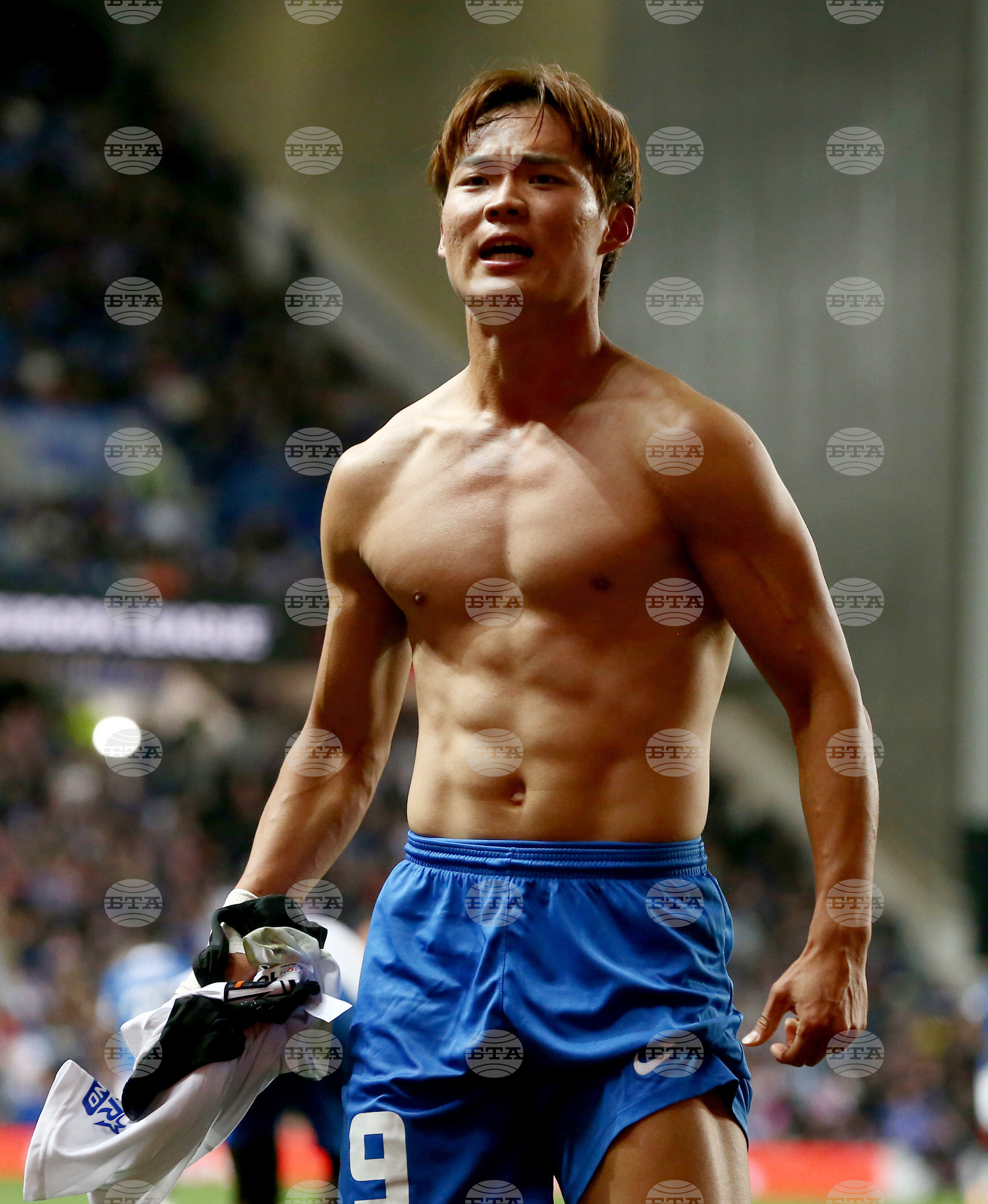 Genk's Oh Hyeon-Gyu, rear, scores his sides first goal against Rangers during a Europa League soccer match at Ibrox Stadium in Glasgow, Scotland, Thursday, Sept. 25, 2025. (Ewan Bootman/PA via AP)