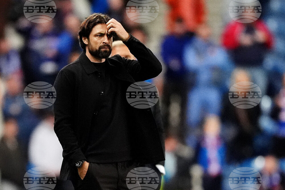 Rangers manager Russell Martin watches from the touchline during a Europa League soccer match against Genk at Ibrox Stadium in Glasgow, Scotland, Thursday, Sept. 25, 2025. (Andrew Milligan/PA via AP)
