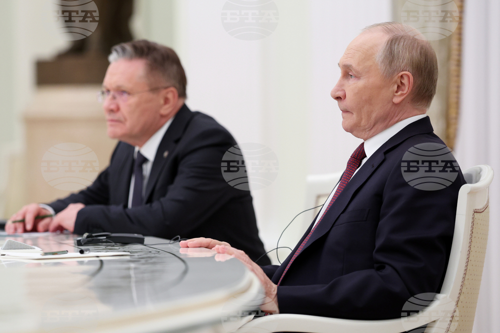 Russian President Vladimir Putin, right, accompanied by Russian State Atomic Energy Corporation Rosatom CEO Alexey Likhachev, attends a meeting with International Atomic Energy Agency (IAEA) Director General Rafael Grossi during their meeting at the Senate Palace of the Kremlin in Moscow, Russia, Thursday, Sept. 25, 2025. (Ramil Sitdikov/Pool Photo via AP)