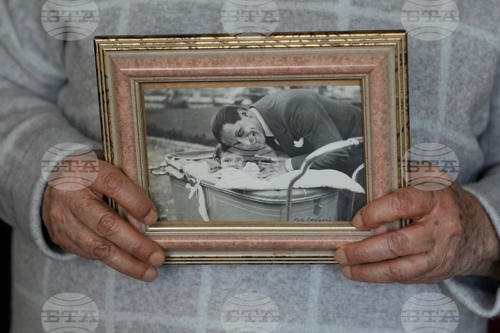Gloria Gaitan — the daughter of politician Jorge Eliecer Gaitan, who was assassinated in 1948 — holds up a photo of him and herself during her childhood, at her home in Bogota, Colombia, Thursday, Sept. 25, 2025. (AP Photo/Fernando Vergara)