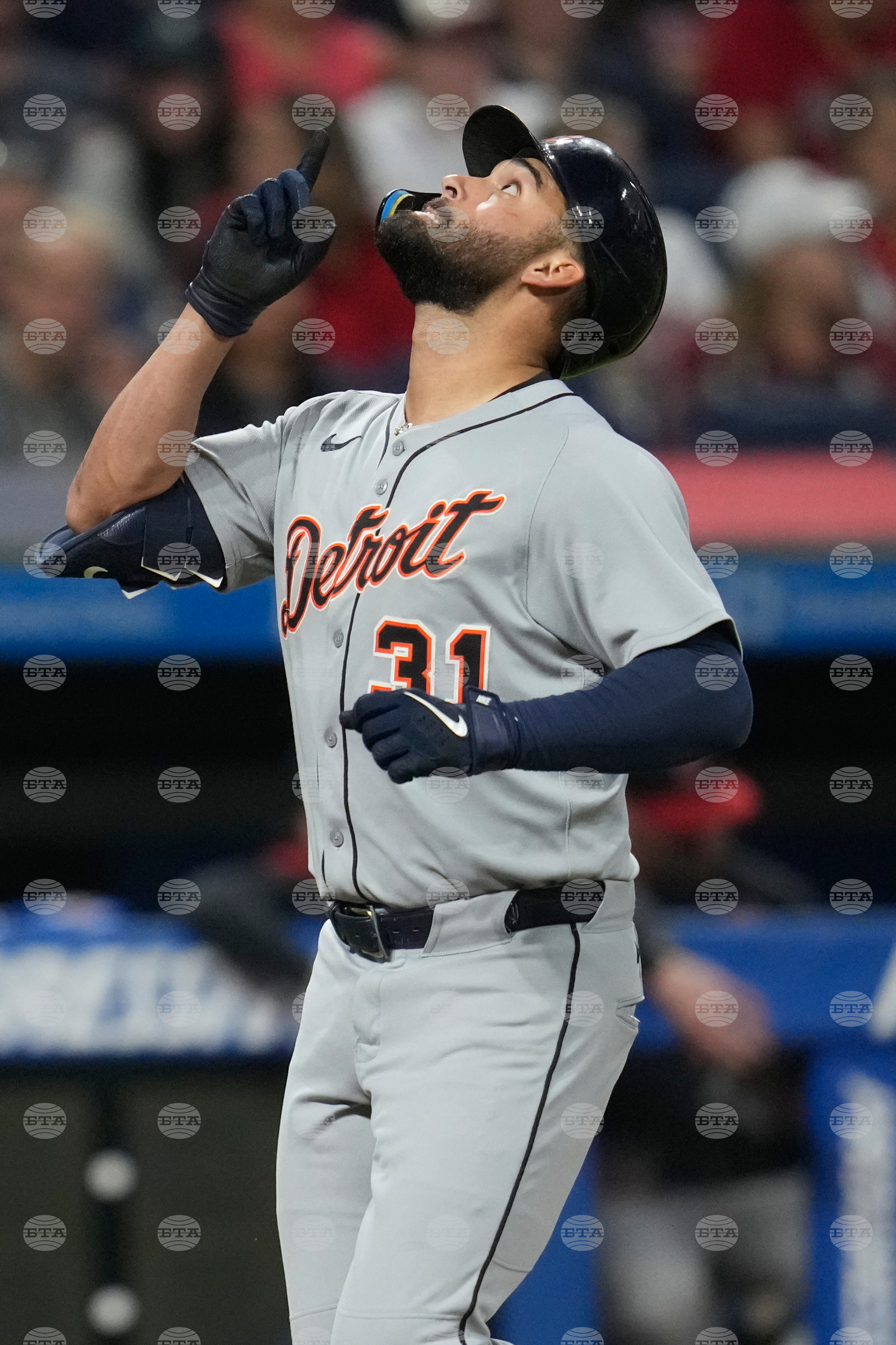 Detroit Tigers' Riley Greene (31) gestures as he runs to home plate with a home run in the fourth inning of a baseball game against the Cleveland Guardians in Cleveland, Thursday, Sept. 25, 2025. (AP Photo/Sue Ogrocki)