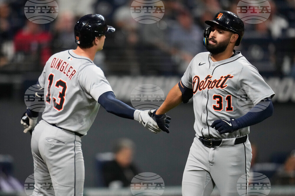 Detroit Tigers' Riley Greene (31) is congratulated by Dillon Dingler (13) after hitting a home run in the fourth inning of a baseball game against the Cleveland Guardians in Cleveland, Thursday, Sept. 25, 2025. (AP Photo/Sue Ogrocki)