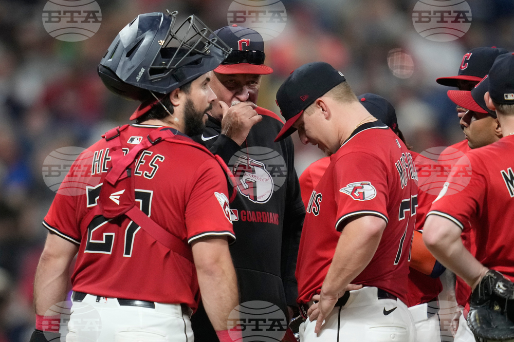 Cleveland Guardians pitching coach Carl Willis, center, and catcher Austin Hedges (27) talk with starting pitcher Parker Messick, right, in the fifth inning of a baseball game against the Detroit Tigers in Cleveland, Thursday, Sept. 25, 2025. (AP Photo/Sue Ogrocki)