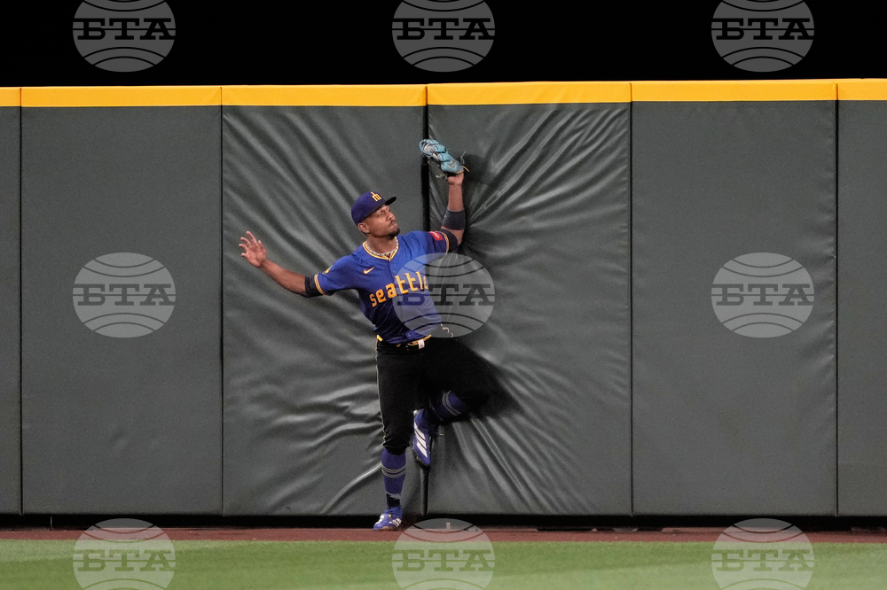 Seattle Mariners center fielder Julio Rodriguez collides with the wall after catching a fly out by Colorado Rockies' Mickey Moniak during the third inning of a baseball game, Thursday, Sept. 25, 2025, in Seattle. (AP Photo/Ryan Sun)