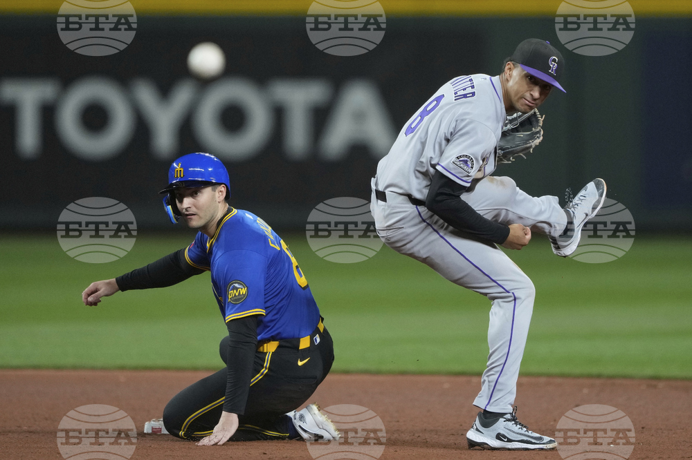 Colorado Rockies second baseman Ryan Ritter, right, attempts to throw out Seattle Mariners' Mitch Garver after forcing out Mariners' Dominic Canzone, left, during the seventh inning of a baseball game, Thursday, Sept. 25, 2025, in Seattle. (AP Photo/Ryan Sun)