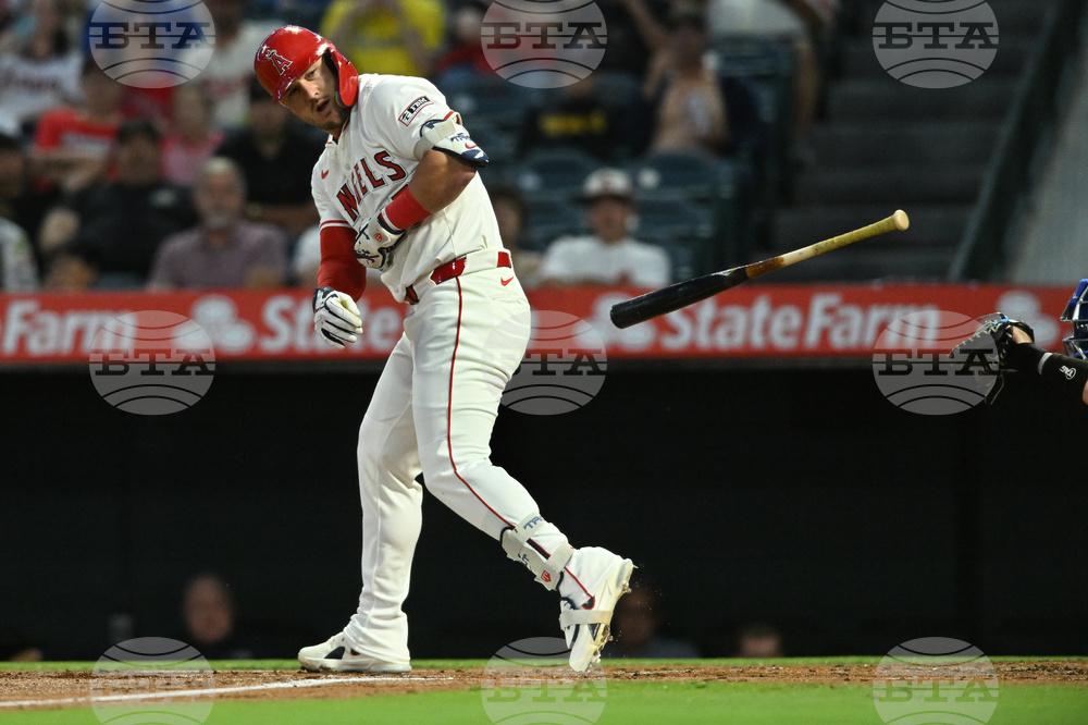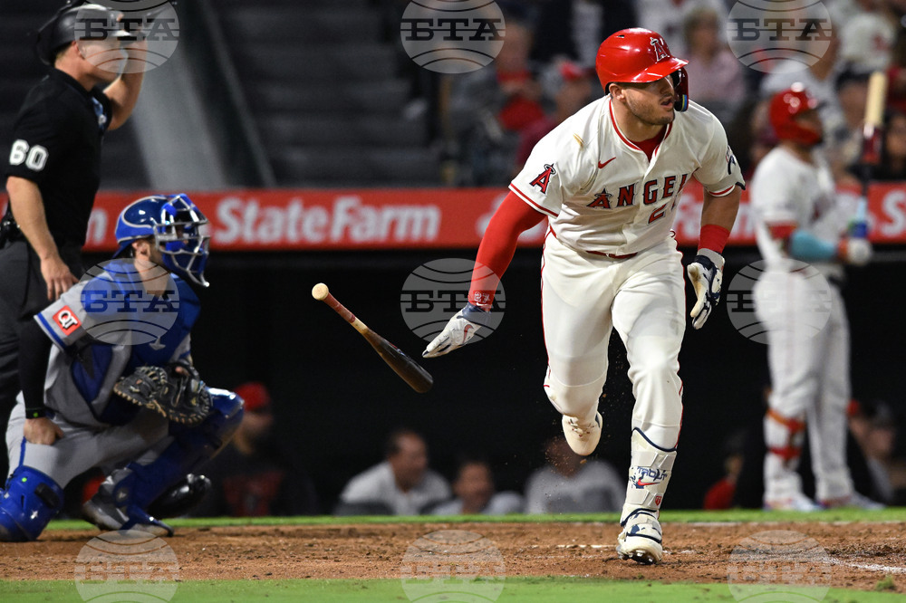 Los Angeles Angels' Mike Trout throws his bat as he walks to first base but is called for a third strike against he Kansas City Royals during the first inning of a baseball game Thursday, Sept. 25, 2025, in Anaheim, Calif. (AP Photo/Wally Skalij)