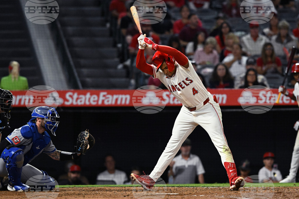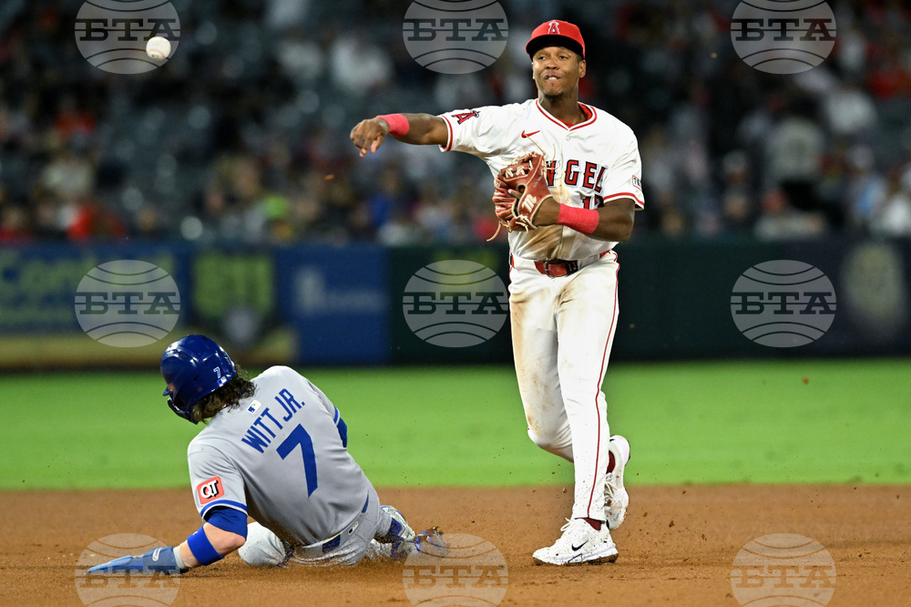 Los Angeles Angels shortstop Denzer Guzman (13) forces out Kansas City Royals base runner Bobby Witt Jr. (7) at second base in the third inning of a baseball game Thursday, Sept. 25, 2025, in Anaheim, Calif. (AP Photo/Wally Skalij)