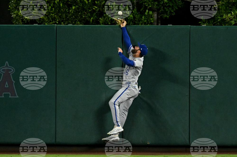 Kansas City Royals outfielder John Rave (16) can't make the catch as Los Angeles Angels batter Mike Trout hits two-run home run in the eighth inning of a baseball game Thursday, Sept. 25, 2025, in Anaheim, Calif. (AP Photo/Wally Skalij)