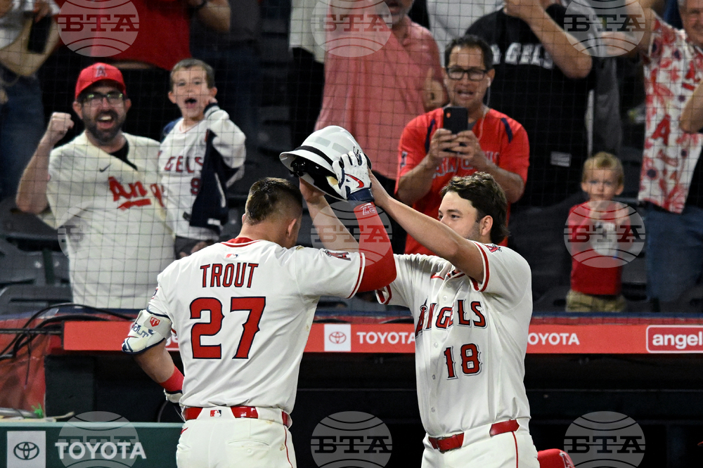 Los Angeles Angels Mike Trout (27) receives a helmet from teammate Nolan Schanuel (18) after a two-run home run against the Kansas City Royals in the eighth inning of a baseball game Thursday, Sept. 25, 2025, in Anaheim, Calif. (AP Photo/Wally Skalij)