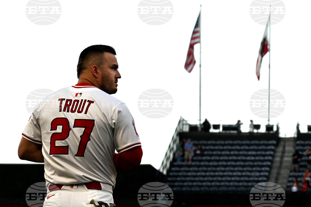 Los Angeles Angels outfielder Mike Trout (27) listens to the national anthem before a baseball game against the Royals Thursday, Sept. 25, 2025, in Anaheim, Calif. (AP Photo/Wally Skalij)