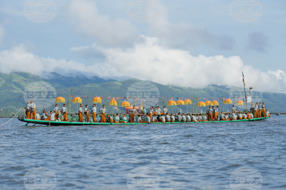 Intha ethnic people row on a long boat in a procession carrying Buddha images to a monastery during the Phaung Daw Oo pagoda festival Friday, Sept. 26, 2025, in Inle Lake, southern Shan State, Myanmar. (AP Photo/Thein Zaw)