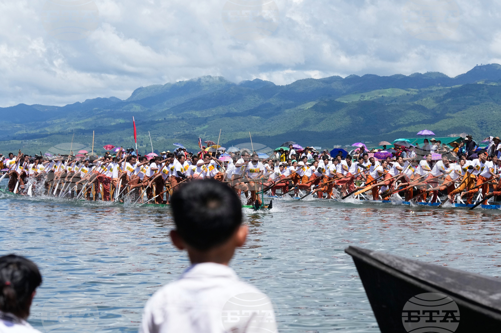 Intha ethnic people row their boats during a traditional boats racing competition to mark the Phaung Daw Oo pagoda festival Friday, Sept. 26, 2025, in Inle Lake, southern Shan State, Myanmar. (AP Photo/Thein Zaw)