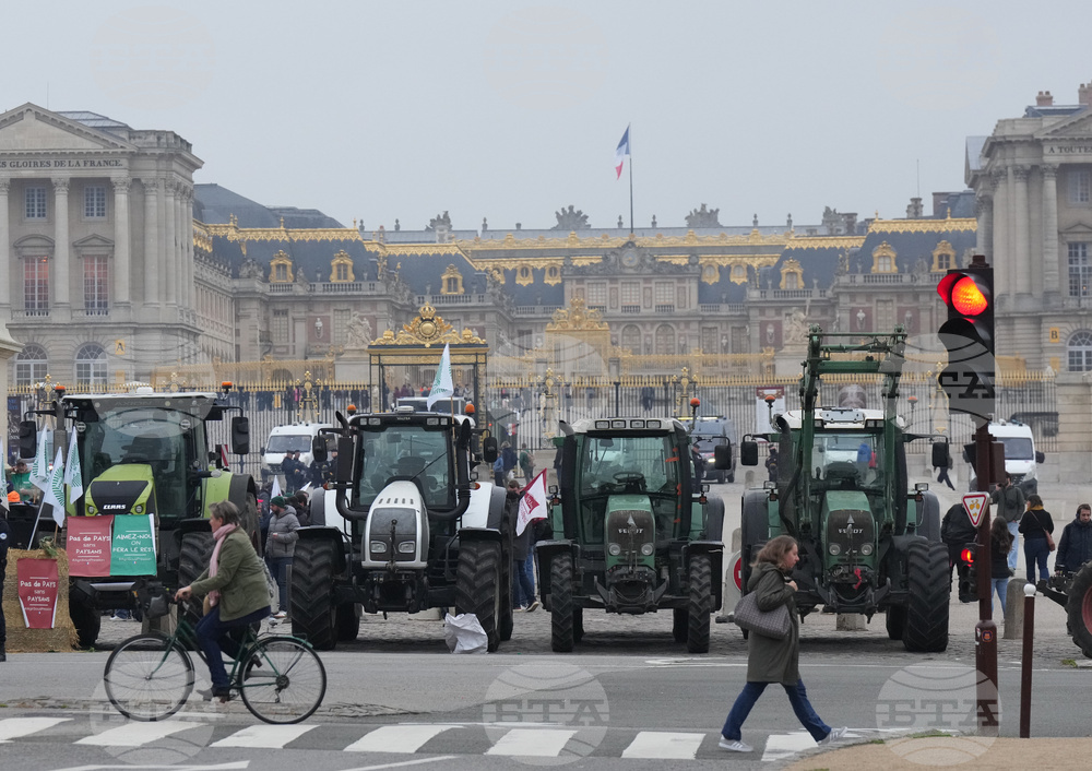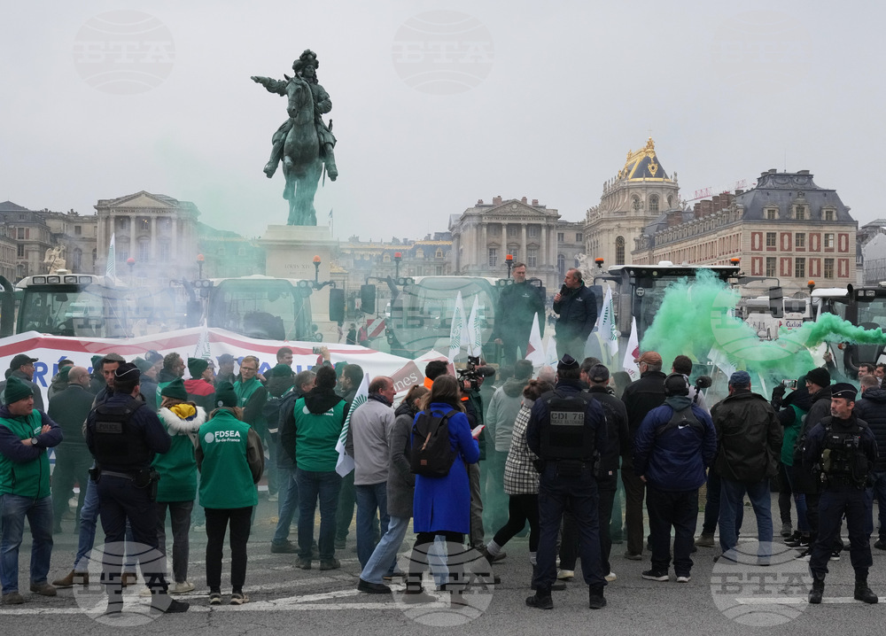 Farmers behind a banner reading "The farmers revolt resumes in Versailles" demonstrate outside the Chateau de Versailles to protest against the planned EU-Mercosur trade deal, Friday, Sept. 26, 2025 in Versailles, outside Paris. (AP Photo/Michel Euler)
