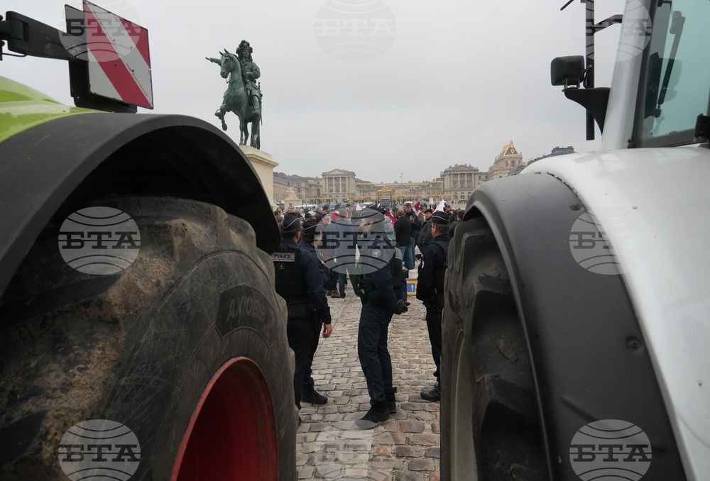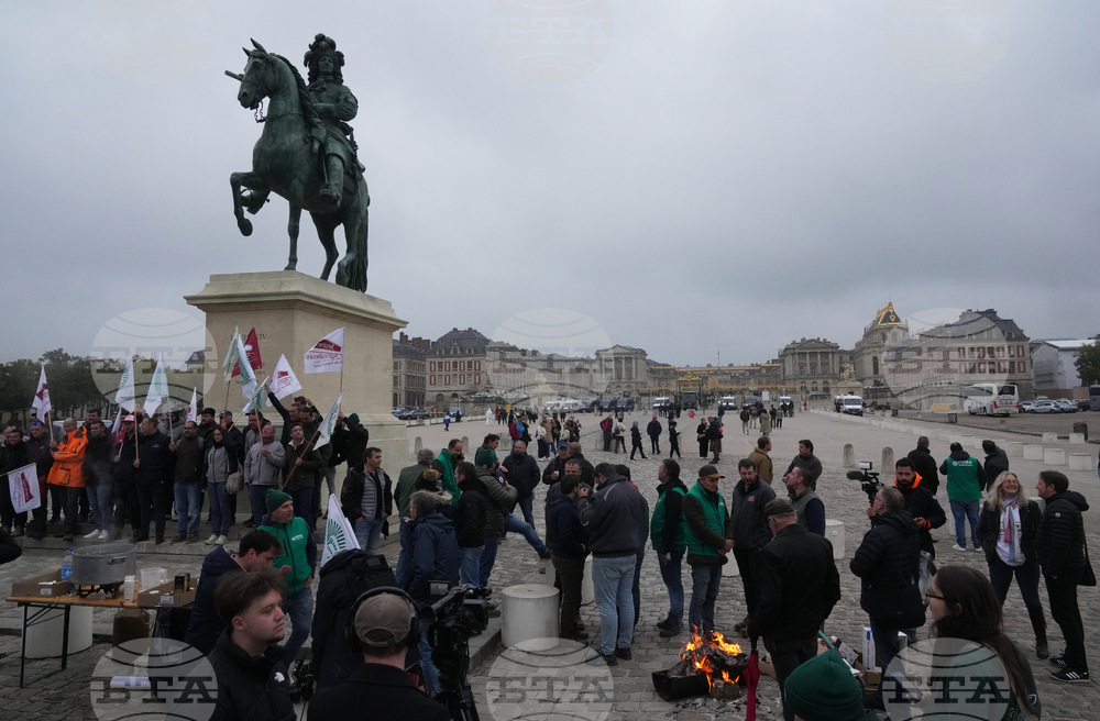 Farmers demonstrate outside the Chateau de Versailles to protest against the planned EU-Mercosur trade deal, Friday, Sept. 26, 2025 in Versailles, outside Paris. (AP Photo/Michel Euler)