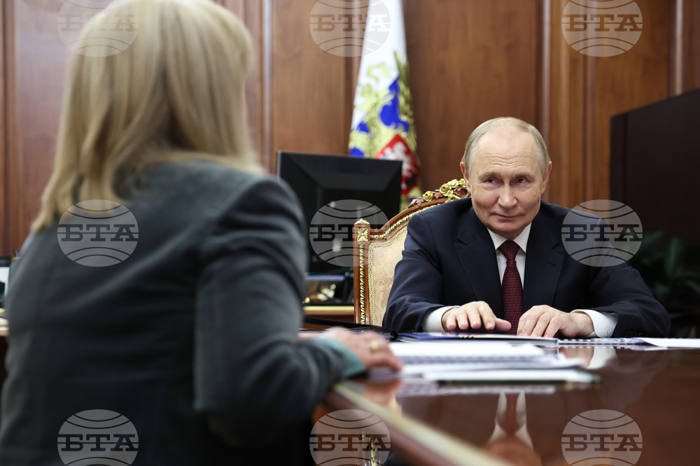 Russian President Vladimir Putin, right, listens to Ella Pamfilova, head of Russian Central Election Commission during their meeting a the Kremlin in Moscow, Russia, Friday, Sept. 26, 2025. (Alexander Kazakov, Sputnik, Kremlin Pool Photo via AP)