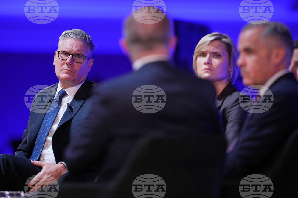 Britain's Prime Minister Keir Starmer, left, listens during a pannel discussion during the Progress Global Action Summit, in London, Friday, Sept. 26, 2025, second right is Iceland Prime Minister Kristrún Mjöll Frostadóttir, and at right is Canadian Prime Minister Mark Carney. (AP Photo/Kin Cheung)