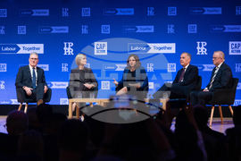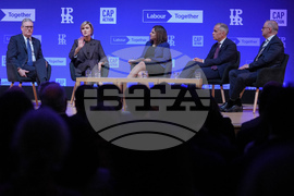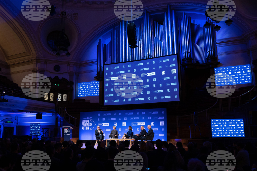 From left, Britain's Prime Minister Keir Starmer, Iceland Prime Minister Kristrún Mjöll Frostadóttir, moderator Neera Tanden, Prime Minister of Canada Mark Carney, and Prime Minister of Australia Anthony Albanese attend the Progress Global Action Summit, in London, Friday, Sept. 26, 2025. (Niklas Halle'n/Pool Photo via AP)