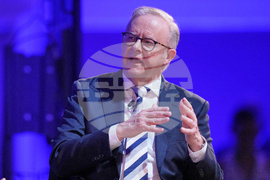 Prime Minister of Australia Anthony Albanese gestures as he speaks during the Progress Global Action Summit, in London, Friday, Sept. 26, 2025. (AP Photo/Kin Cheung)