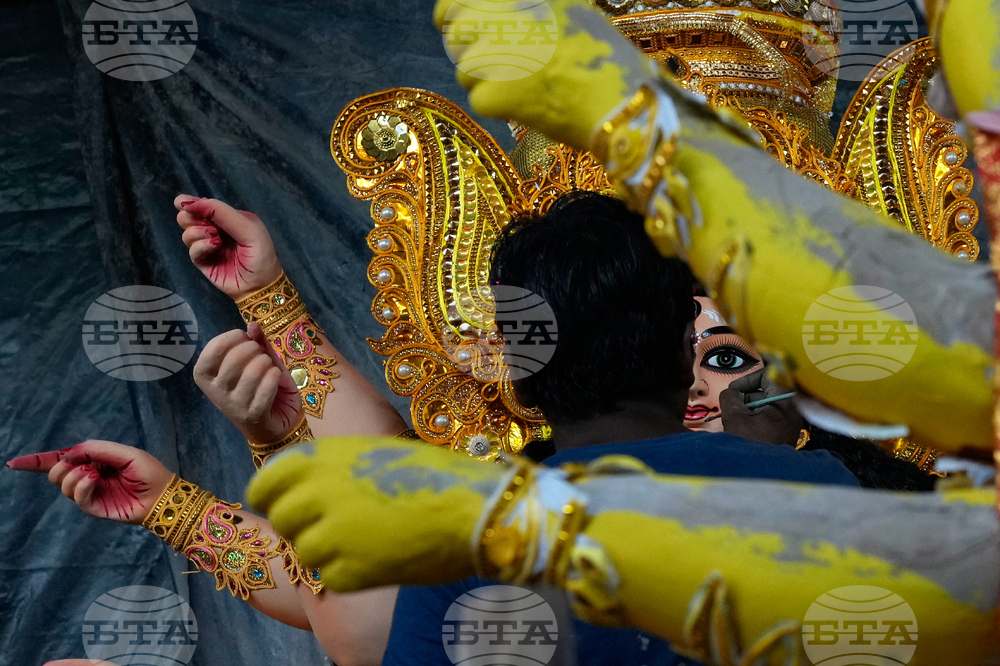 An artisan gives finishing touches to an idol of Hindu goddess Durga at a workshop amid Durga Puja festivities in Mumbai, India, Friday, Sept. 26, 2025. (AP Photo/Rajanish Kakade)