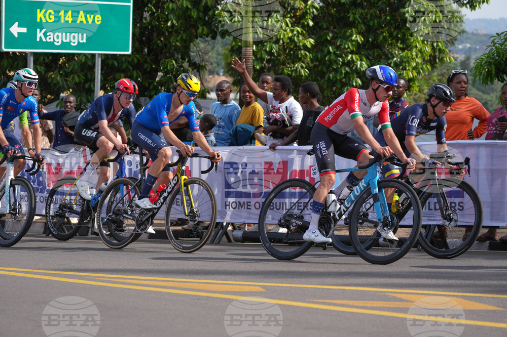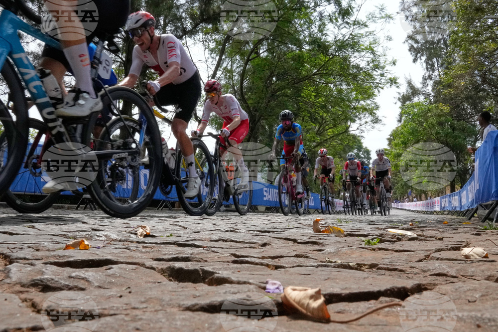 Competitors pedal during the men's Under 23 road race, at the road cycling World Championships in Kigali, Rwanda, Friday, Sept. 26, 2025. (AP Photo/Jerome Delay)