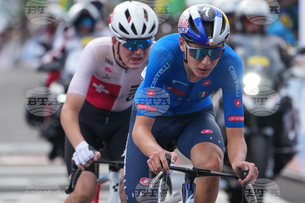Italy's Mark Lorenzo Finn, right, leads Swit'zerland's Jan Huber during the men's Under 23 road race, at the road cycling World Championships in Kigali, Rwanda, Friday, Sept. 26, 2025. (AP Photo/Jerome Delay)