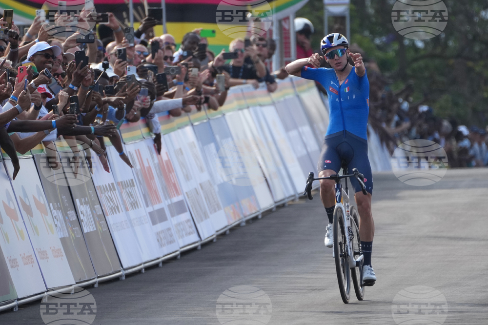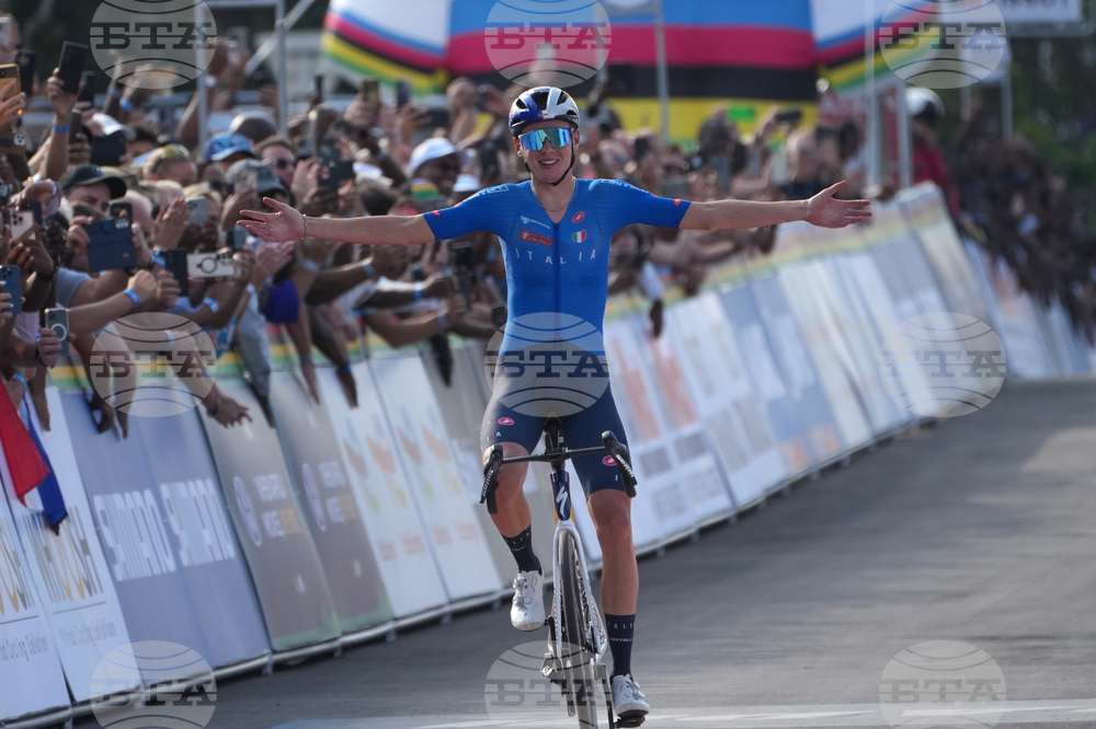 Italy's Mark Lorenzo Finn celebrates as he approaches the finish line to win the men's Under 23 road race, at the road cycling World Championships in Kigali, Rwanda, Friday, Sept. 26, 2025. (AP Photo/Jerome Delay)