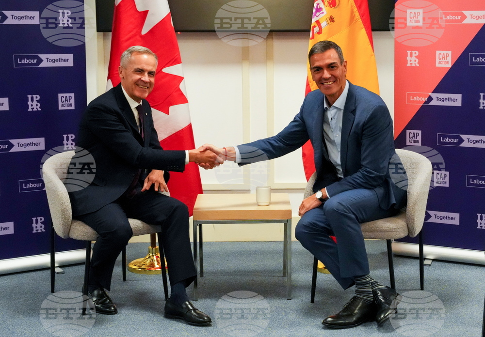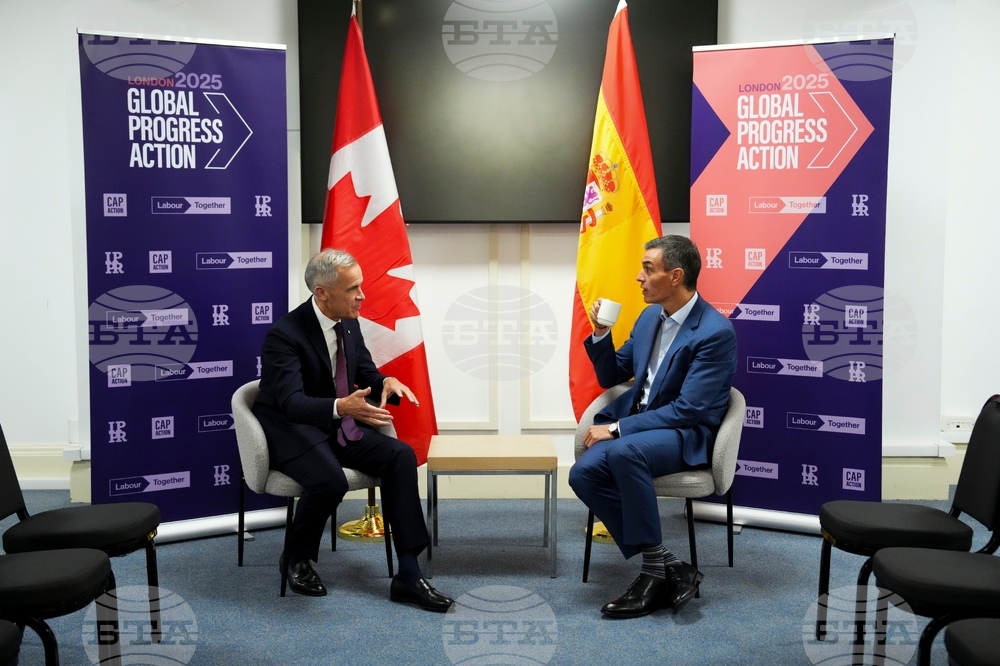 Prime Minister Mark Carney takes part in a bilateral meeting with Prime Minister of Spain Pedro Sanchez during the Global Progress Action Summit in London on Friday, Sept. 26, 2025. (Sean Kilpatrick /The Canadian Press via AP)