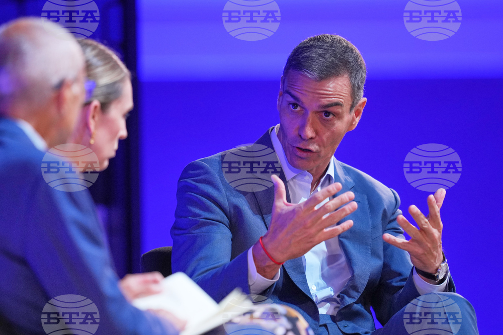 Prime Minister of Spain Pedro Sánchez gestures as he speaks at the Global Progress Action Summit, in London, Friday, Sept. 26, 2025. (AP Photo/Kin Cheung)