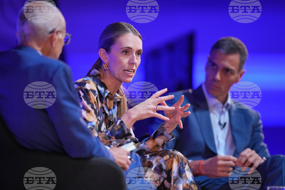 Former Prime Minister of New Zealand Jacinda Ardern, left, listens to Prime Minister of Spain Pedro Sánchez as he speaks at the Global Progress Action Summit, in London, Friday, Sept. 26, 2025. (AP Photo/Kin Cheung)