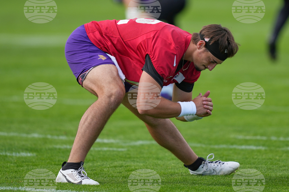 Minnesota Vikings quarterback Max Brosmer (12) stretches during a training session ahead of their match against Pittsburgh Steelers in Dublin, Friday, Sept. 26, 2025.(AP Photo/Frank Augstein)