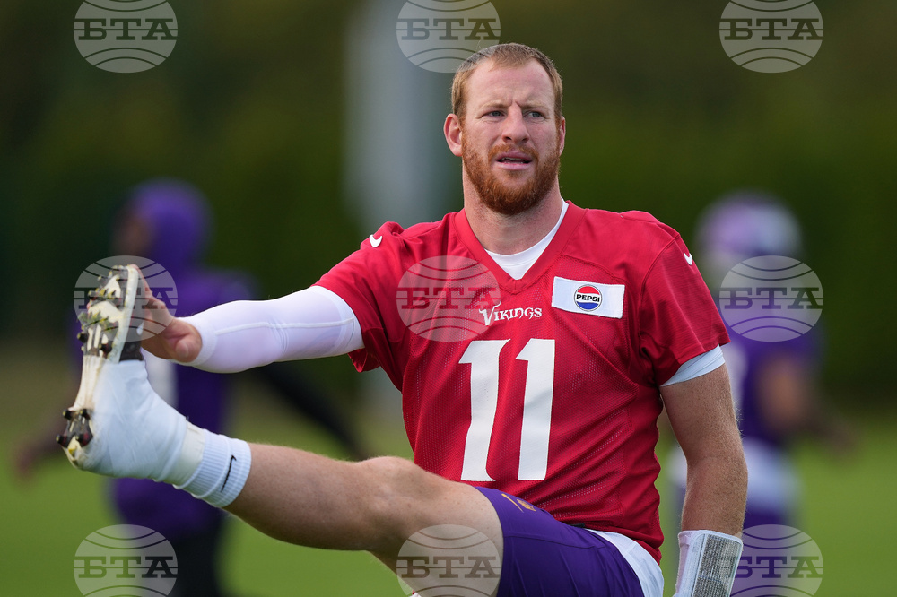 Minnesota Vikings quarterback Carson Wentz (11) stretches during a training session ahead of their match against Pittsburgh Steelers in Dublin, Friday, Sept. 26, 2025.(AP Photo/Frank Augstein)