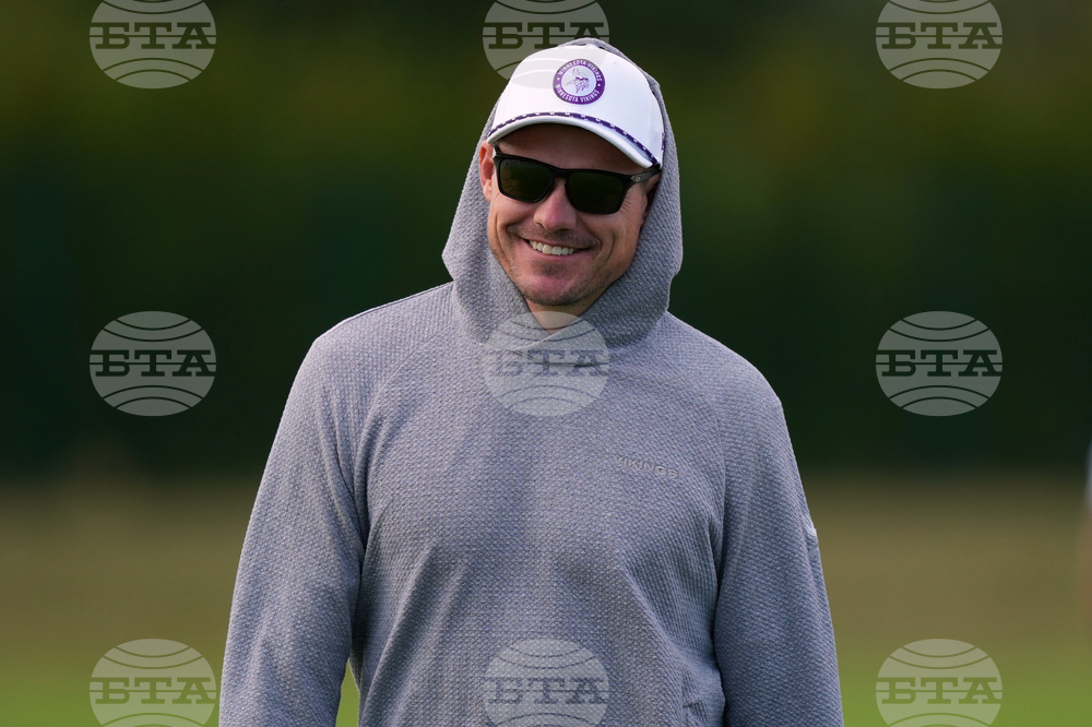 Minnesota Vikings head coach Kevin O'Connell smiles during a training session ahead of their match against Pittsburgh Steelers in Dublin, Friday, Sept. 26, 2025.(AP Photo/Frank Augstein)