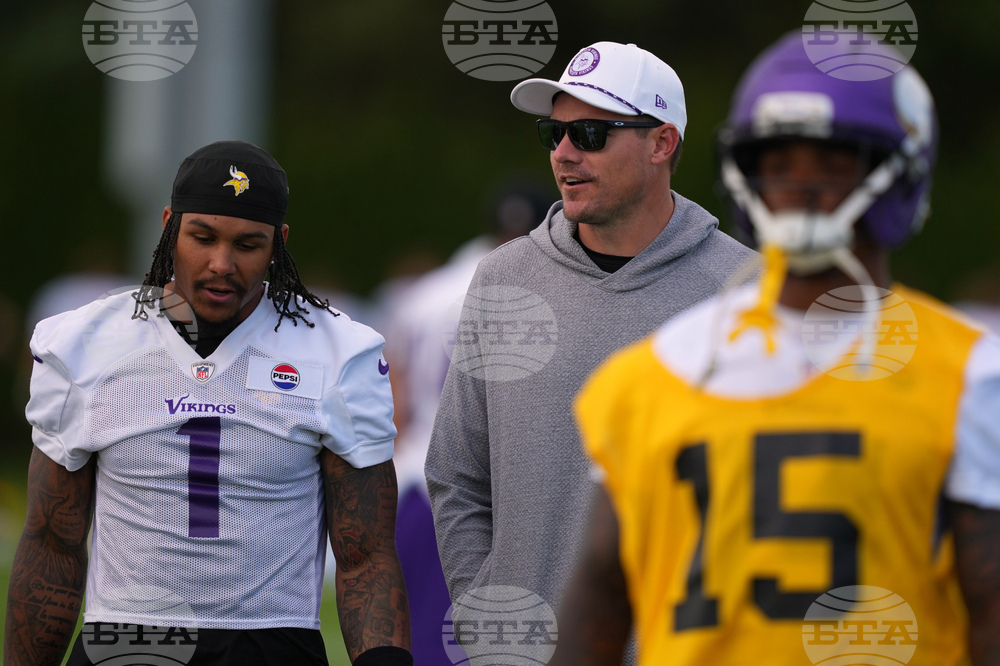 Minnesota Vikings head coach Kevin O'Connell talks to Minnesota Vikings wide receiver Jalen Nailor (1), left, during a training session ahead of their match against Pittsburgh Steelers in Dublin, Friday, Sept. 26, 2025.(AP Photo/Frank Augstein)